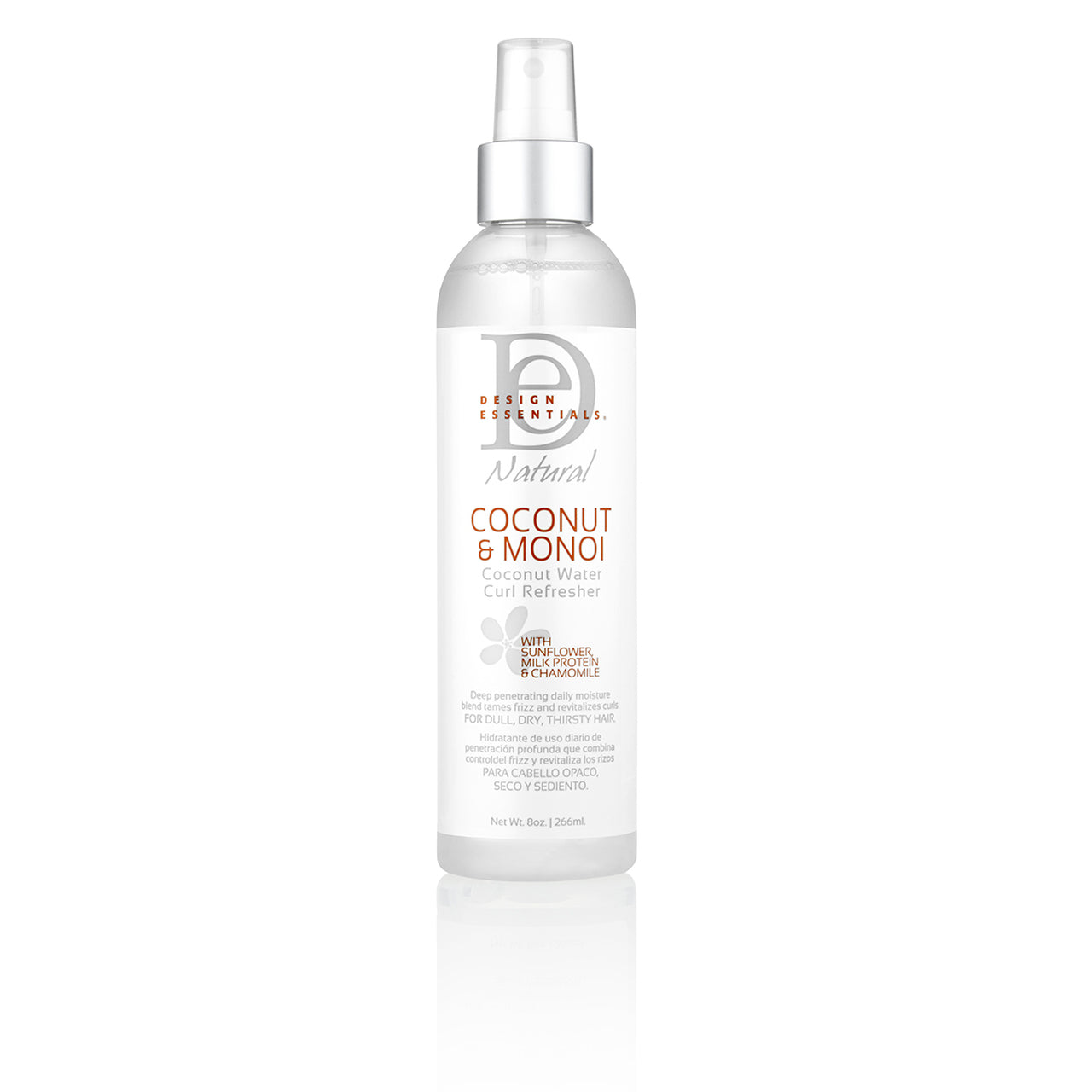 Design Essentials® Coconut & Monoi Coconut Water Curl Refresher, infused with Sunflower, Milk Protein and Chamomile, is a lightweight curl quencher that instantly revitalizes coils with our triple hydrating Monoi Moisture Blend. Our unique curl refresher is formulated with lightweight silk proteins and a replenishing blend of active botanicals, including Calendula and Horsetail, plus Vitamin E to restore over-worked curls. With daily use, thirsty curls are deeply penetrated while taming frizz. Perfect for reworking or revitalizing Day 2 or Day 3 wash and go styles, soft-hold styles, twist-sets, and braid-outs.