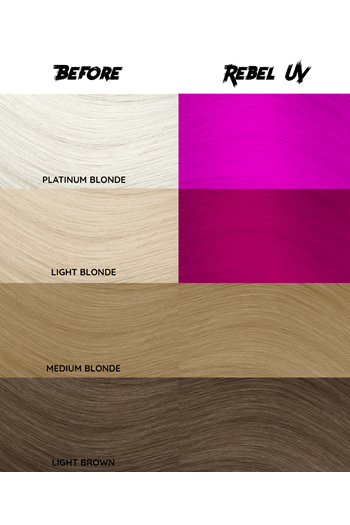 Be a rebel with this neon pink UV hair dye! This is the most head-turning pink within our collection and pops in both natural light and blacklight. You will be the talk of the party with this look! For the best results, lighten your hair to level 9 or 10 (blonde) before application.
