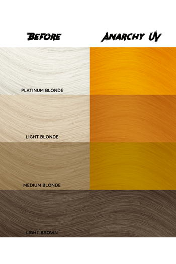 This yellow-toned orange UV hair dye will have you shining bright! Anarchy UV is a vibrant shade that pops in natural light and will glow in blacklight. For the best results, we recommend lightening your hair to a level 9 or 10 (blonde) before use.