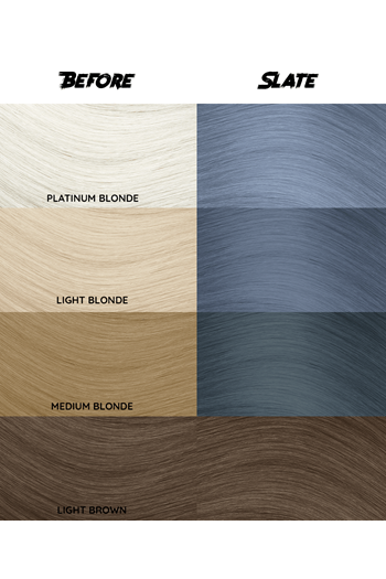 Slate is a metallic blue hair dye which is packed full of quartz. This shade will create steel blue hair which will shine under light. For the best results, we recommend lightening your hair to level 9 or 10 (blonde) before use.