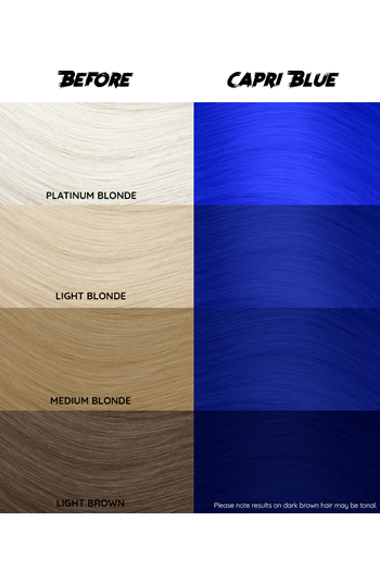 Capri Blue is a semi-permanent bright blue hair dye that is inspired by the coastal summer sky. This vivid shade has been created using our conditioning formula which is super gentle on your hair. To achieve stunning electric blue hair, we recommend lightening to a level 9 or 10 (blonde) before application. It is also suitable for level 8 hair (light brown), however, results will only be tonal.