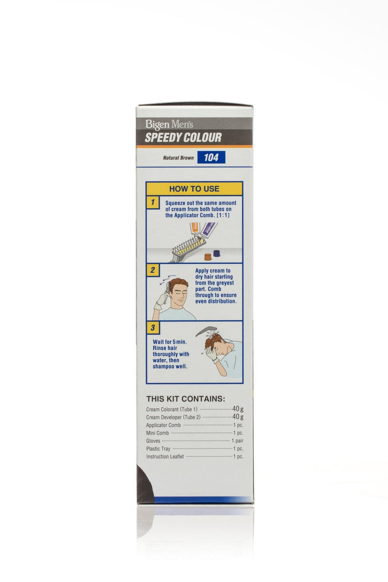 Bigen Men's Speedy Colour Dark Brown 104 is a unique formula with conditioning agents (Olive oil, Glycerin and Pullulan) which gives natural shade, luster and moisture by penetrating deeply into each hair. Natural healthy looking results. No Ammonia.
