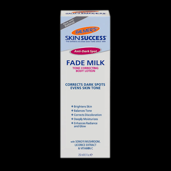 Palmer's® Skin Success® Anti-Dark Spot Fade Milk is a tone correcting body lotion that targets pigment-prone areas such as knees, elbows, feet and décolletage to help correct unwanted discoloration.