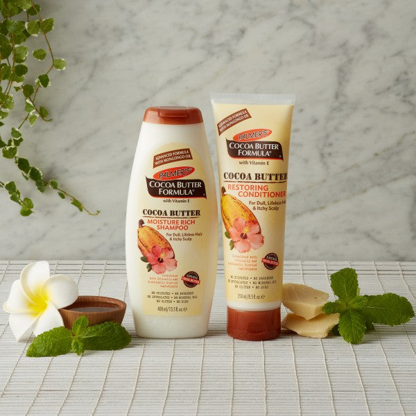 Palmer's Cocoa Butter Formula Restoring Conditioner combines the ultra-moisturising benefits of pure Cocoa Butter and Vitamin E to nourish your hair and scalp, leaving your hair beautifully moisturised and shiny. These luxurious moisturisers will soften your hair for easy styling and manageability. Natural Peppermint Oil is added to refresh hair and soothe dry scalp. Naturally high in Vitamin E and polyunsaturated fats, Mongongo Oil is an excellent emollient for healthy hair and fortified scalp.