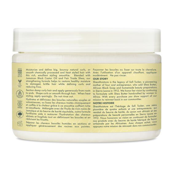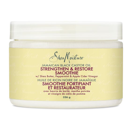 Description: Shea Moisture Jamaican Black Castor Oil Strengthen & Restore Smoothie, chemically processed, heat styled and damaged hair with this rich, emollient hair styling cream. Nutritive Jamaican Black Castor Oil and certified organic Shea Butter Blend in a strengthening formula that delivers healthy moisture to damaged, brittle hair while defining curls and reducing frizz with this hair styling cream. Peppermint oil tingles the scalp for an invigorating experience. |