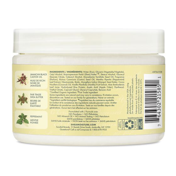 Ingredients: Water, Glycerin (Vegetable), Cetyl Alcohol, Butyrospermum Parkii (Shea) Butter* ♥, Stearyl Alcohol, Glyceryl Stearate Citrate, Cetearyl Alcohol, Macadamia Ternifolia Seed Oil, Fragrance, Ricinus Communis (Castor) Seed Oil, Mentha Piperita (Peppermint) Leaf Extract, Niacinamide, Biotin, Mangifera Indica (Mango) Seed Butter, Cocos Nucifera (Coconut) Oil, Vanilla Planifolia (Vanilla) Fruit Extract, Aloe Barbadensis Leaf Juice, Hydrolyzed Rice Protein, Acetic Acid (Apple Cider), Panthenol, Triethyl Citrate, Caprylyl Glycol, Glyceryl Caprylate, Benzoic Acid |