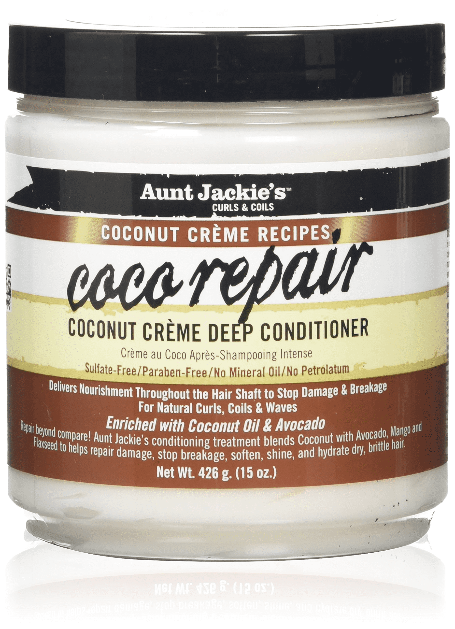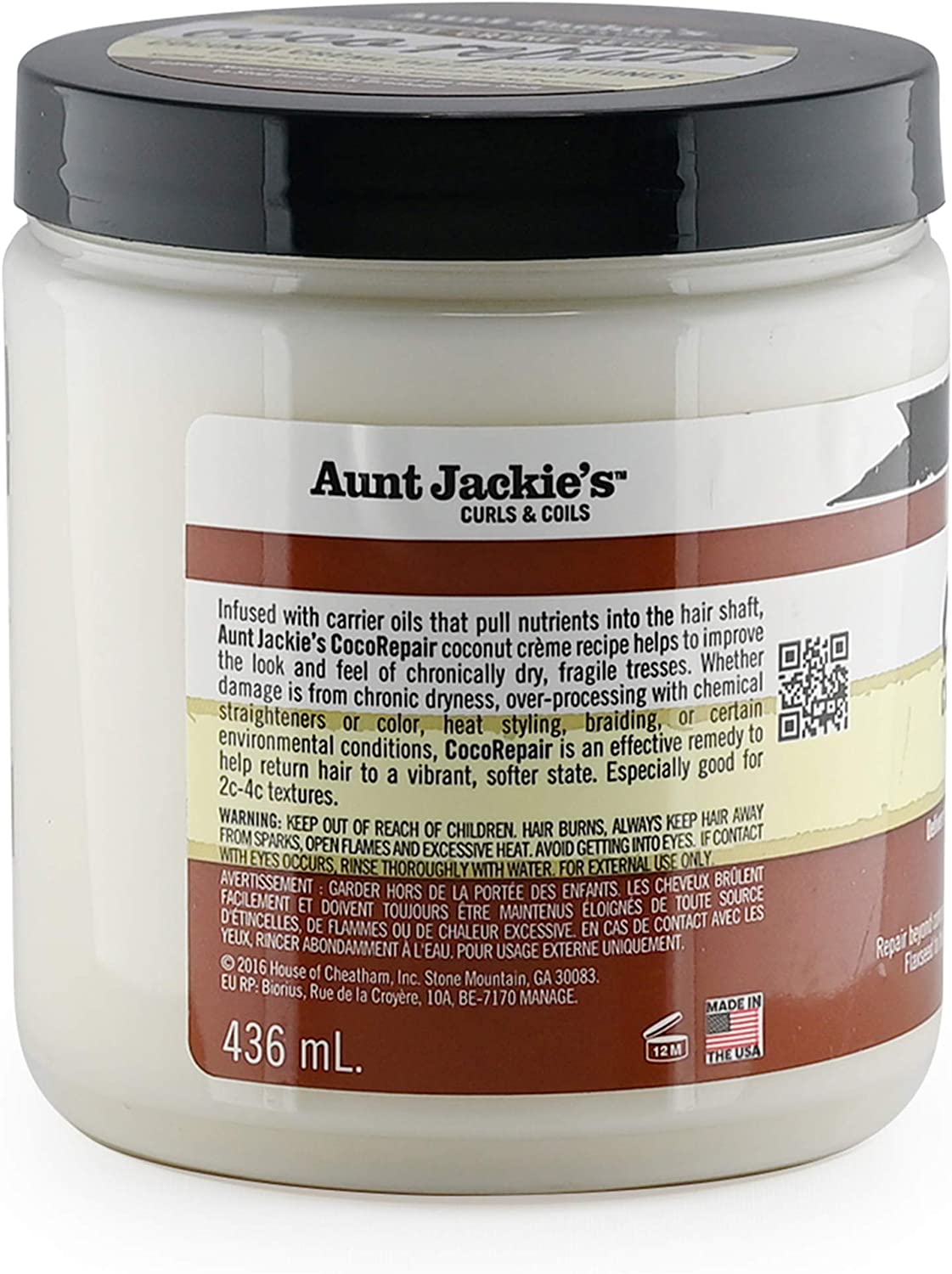 Infused with carrier oils that pull nutrients into the hair shaft, Aunt Jackie’s Coco Repair recipe helps to improve the look and feel of chronically dry, fragile tresses. Whether damage is from chronic dryness, over-processing with chemical straighteners or color, heat styling, braiding, or certain environmental conditions, CocoRepair is an effective remedy to help return hair to a vibrant, softer state.