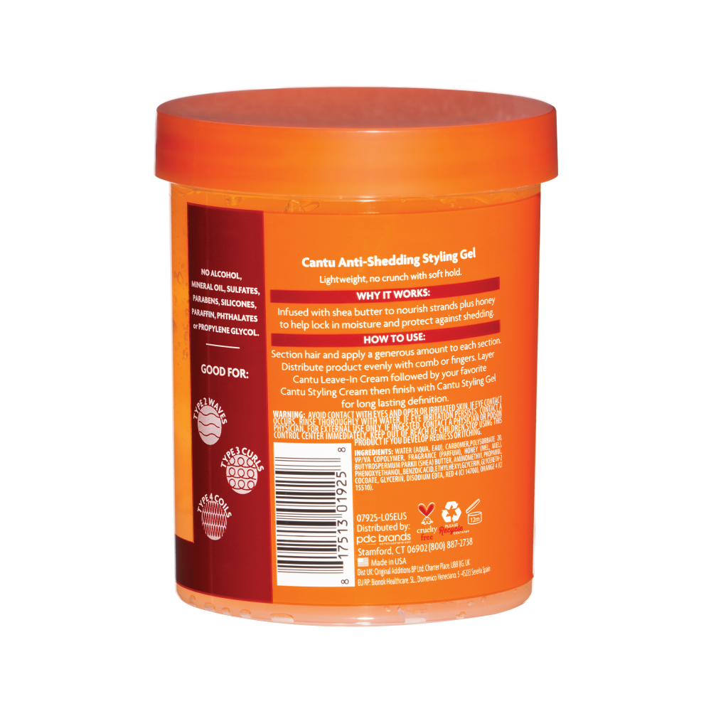 Description: Cantu Styling Gel, infused with Honey, is perfect for flexible hold and to help elongate curls and protect against shedding. Made with 100% Shea Butter, Cantu reveals your real, authentic beauty. Embrace your curly, coily or wavy hair with Cantu. |