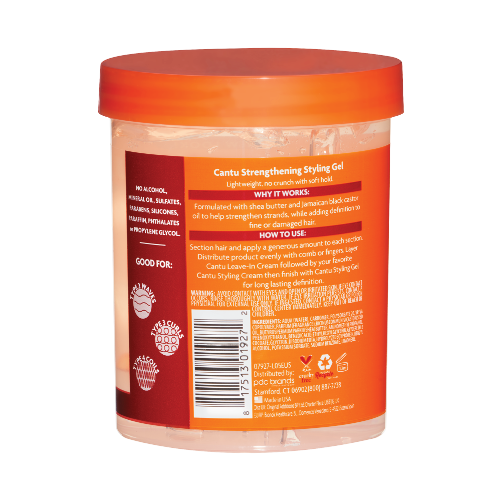 Description: Cantu Styling Gel, infused with Jamaican Black Castor Oil, is perfect for flexible hold and to help strengthen strands, while adding definition to fine or damaged hair. Made with 100% Shea Butter, Cantu reveals your real, authentic beauty. Embrace your curly, coily or wavy hair with Cantu. |