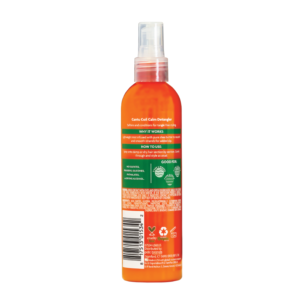 Description: Cantu Coil Calm Detangler softens and conditions hair for easy, tangle-free styling. Made with pure Shea Butter, Cantu restores your real, authentic beauty. Embrace your curly, coily or wavy hair with Cantu. |