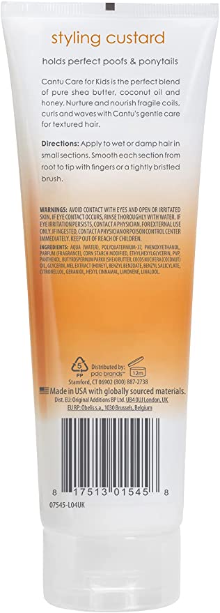 Cantu Care is designed to gently nurture the curls ofboys and girls. Use the Styling Custard to add long-lasting hold plus definition. Made with 100% pure shea butter, coconut oil, and aloe vera plus formulated without harsh ingredients and chemicals. No Mineral Oil, Sulfates, Parabens, Silicone, Phthalates, Gluten, Paraffin, Propylene, PABA or DEA .