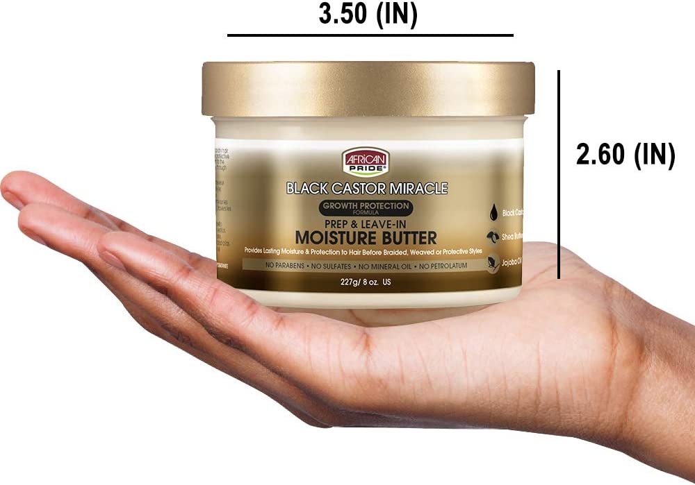 African Pride Black castor Miracle Prep And Leave In Moisture Butter is specially crafted with a blend of Black Castor Oil, Shea Butter and Jojoba Oil to penetrate hair strands and deeply moisturize before braided, weaved or protective styles. Helps to prepare hair for extended styles by providing long-lasting hydration.