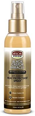 African Pride Black Castor Miracle Anti-Humidity Heat Protectant Spray provides 400°F heat protection and guards against heat damage. Specially crafted with a keratin complex, this lightweight formula blocks humidity, seals in shine and keeps hair straight for 2 weeks or until next wash day. Great for blow drying, flat-ironing, wand curls, silk presses, straigtening leave outs, weaves, & edges.