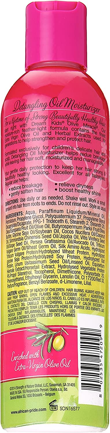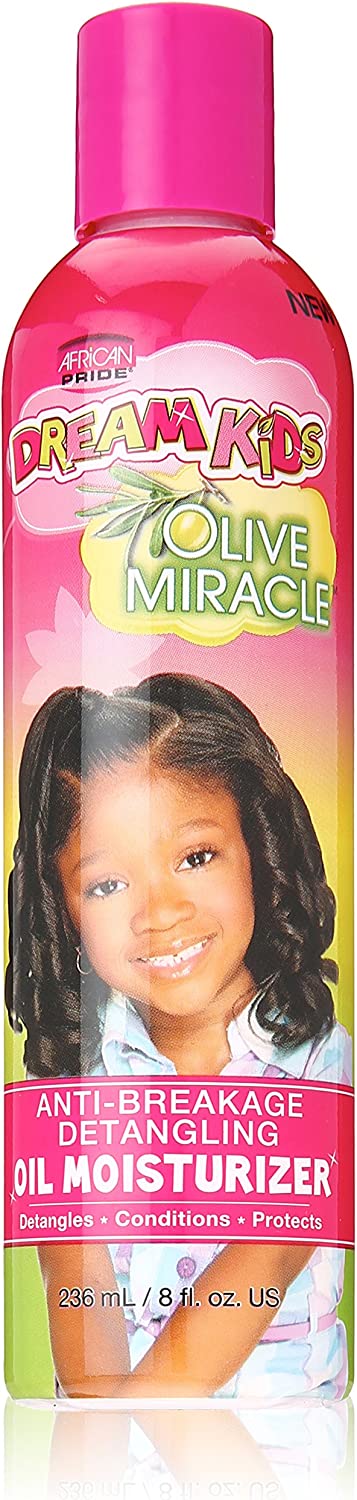 African Pride Dream Kids Oil Moisturizer is a moisture-rich very light child's equation that contains the finest Extra Virgin Olive Oil and Herbal Extracts utilized for ages to help strengthen and secure hair while promoting healthy hair growth. This conditioner is specially formulated for children's delicate hair and scalp, Detangling Oil Moisturizer helps restore natural oils and diminishes breakage while keeping hair delicate, hydrated and manageable. Your regular uses keep your hair solid and perfectly sound looking. Phenomenal for all styles. Recommended for daily use.