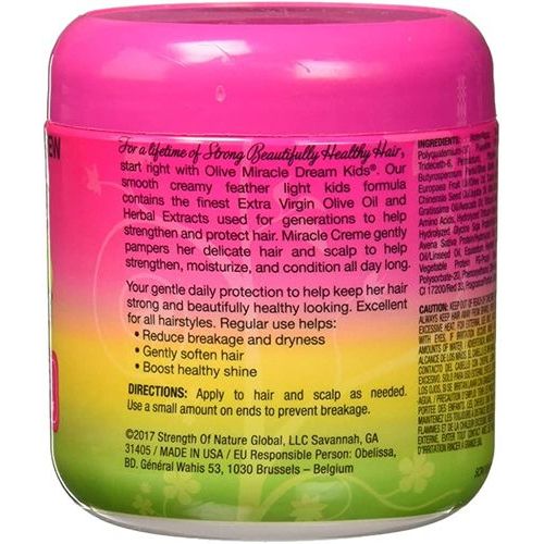 African Pride Dream Kids Miracle Crème is for a lifetime of Strong Beautifully Healthy Hair, begin appropriate with Olive Miracle Dream Kids. Our smooth velvety ultra-light children equation contains the finest Extra Virgin Olive Oil and Herbal Extracts utilized for ages to help strengthen and ensure hair. Miracle crème tenderly massages into sensitive hair and scalp to help strengthen, hydrate, and condition throughout the day. Its daily protection to help keep her hair strong and beautifully healthy looking. Excellent for all hairstyles.