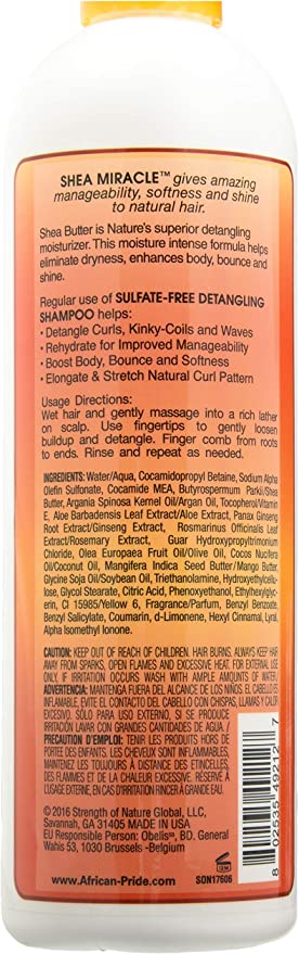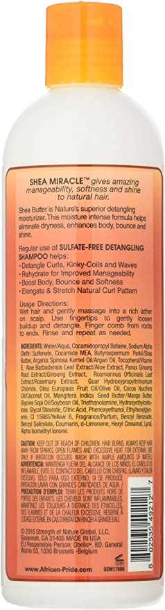 African Pride Shea Butter Miracle Detangling Shampoo creates incredibly slippery, soft tresses, which helps kinkier textures detangle with ease. The smoothing, nourishing ingredients combine to easily tame even the frizziest natural textures.