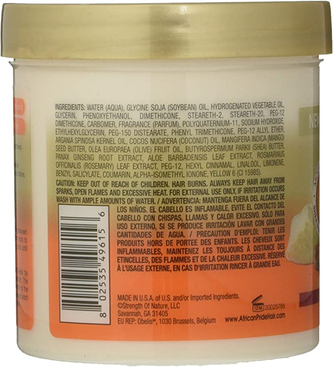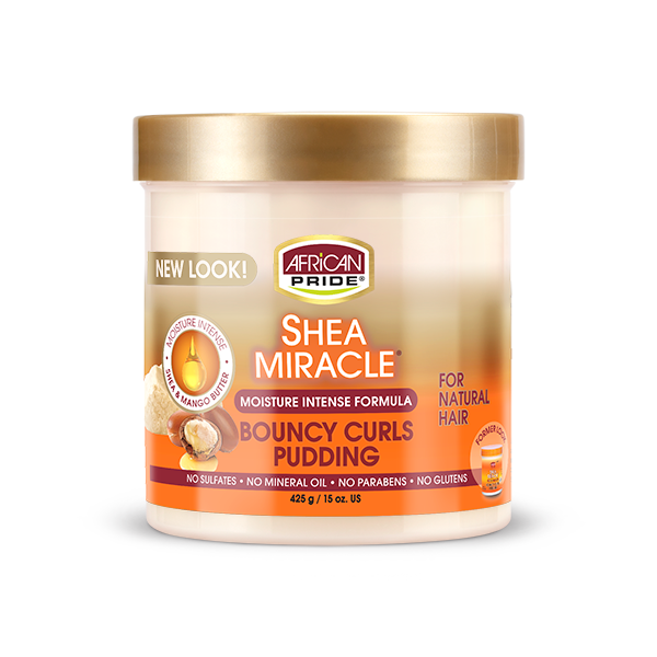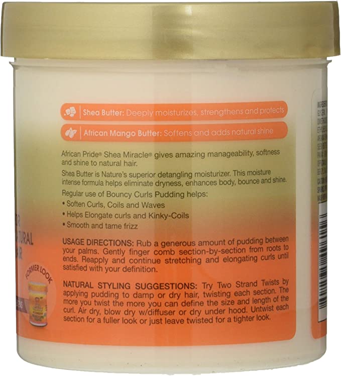 African Pride Shea Butter Bouncy Curls Pudding is a spongy, whipped cream. It is a fabulous styling aid that can be used for setting fluffy finger-styles, coils, two-strand twists, braid-outs and pony puffs.