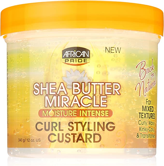 African Pride Shea Miracle Curl Styling Custard gives amazing manageability, softness and shine to naturally curly, wavy, kinky-coily mixed textures.