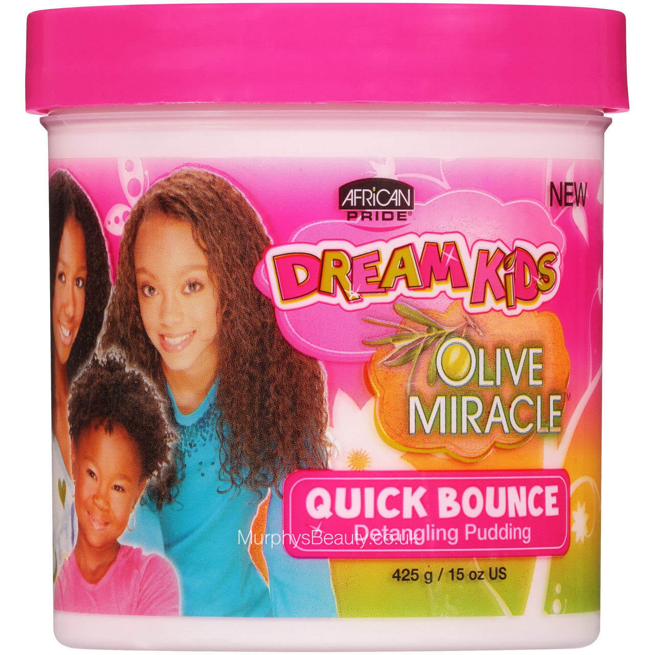 African Pride Dream Kids Olive Miracle Quick Bounce Detangling Pudding formula contains the finest Extra Virgin Olive Oil and Herbal Extracts.