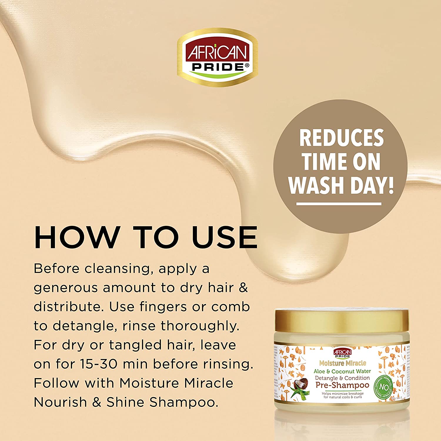 African Pride Moisture Miracle Aloe & Coconut Water Pre-Shampoo is a moisturizing and detangling blend using the natural benefits of Aloe Vera and Coconut Water to condition, protect and remove tangles from natural coils and curls; leaving hair soft and easy to manage during cleansing and styling.