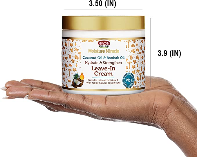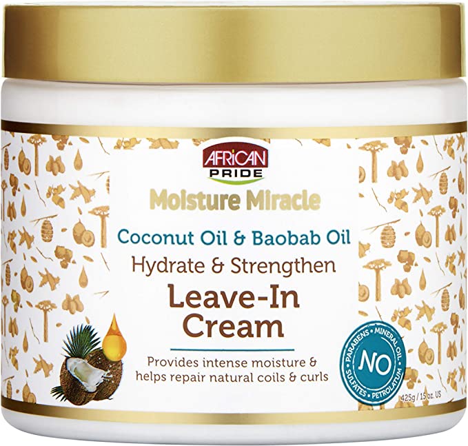African Pride Moisture Miracle Coconut Oil & Baobab Oil Leave-In Cream is a deep penetrating leave-in conditioning cream using a nourishing blend of Coconut Oil & Baobab Oil to impart lasting moisture while helping to protect your hair against breakage.