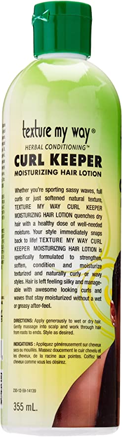 Texture My Way Curl Keeper Moisturizing Hair Lotion quenches dry hair with a healthy dose of well-needed moisture. With this product, you can sport sassy waves, full curls or just softened natural texture. Your style immediately snaps back to life!