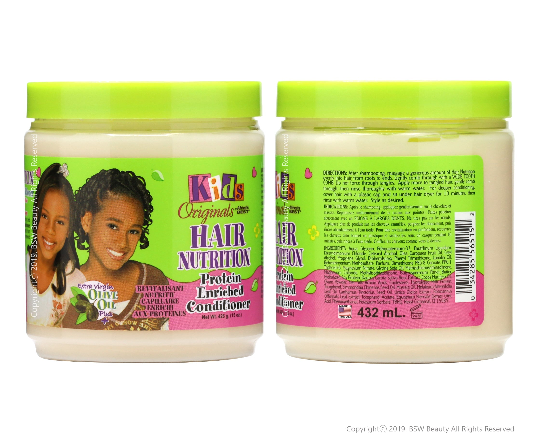Africa's Best Kids Organics Hair Nutrition Protein Enriched Conditioner with Extra Virgin Olive Oil and a natural botanical blend of herbal extracts, vitamins and proteins, Kids Hair Nutrition Protein Enriched Conditioner moisturizes and strengthens weak, damaged or overprocessed hair. With regular use, fragile hair becomes rejuvenated and renewed. Leaves hair healthy looking, shiny and with improved elasticity.