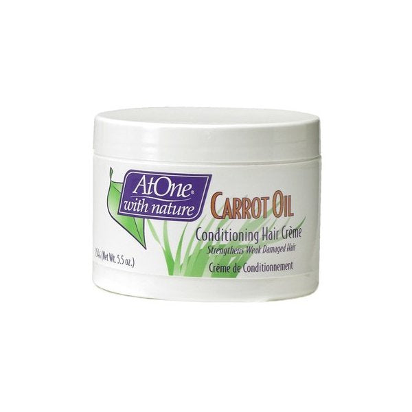 At One With Nature Carrot Oil Creme 5.5 oz Carrot Oil Conditioning Hair Creme strengthens dry natural and chemically treated hair by helping to reconstruct damaged or weakened areas inside and along the outer hair shaft. The moisture rich formula contains Beta Carotene and Vitamin E which are essential for growing healthier hair controlling breakage and shedding and maintaining a healthy scalp. Natural emollients and Botanical extracts of Horsetail Cucumber Chamomile and jojoba oil revive hair and give it elasticity body & shine.