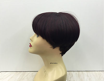 Very full front fringe with full volume smooth, rounded pixie crop style wig.