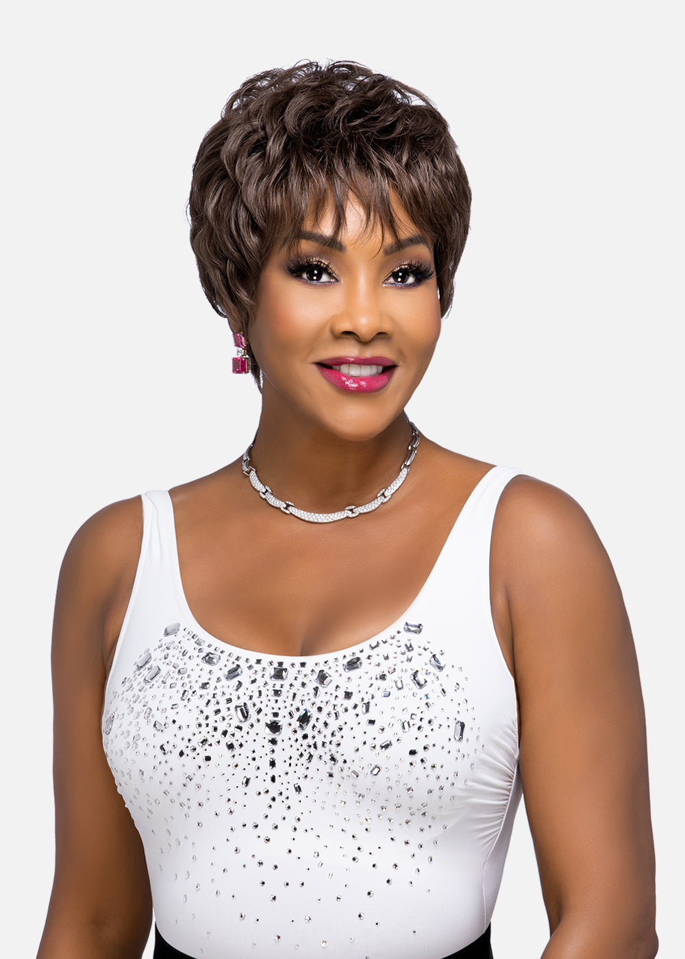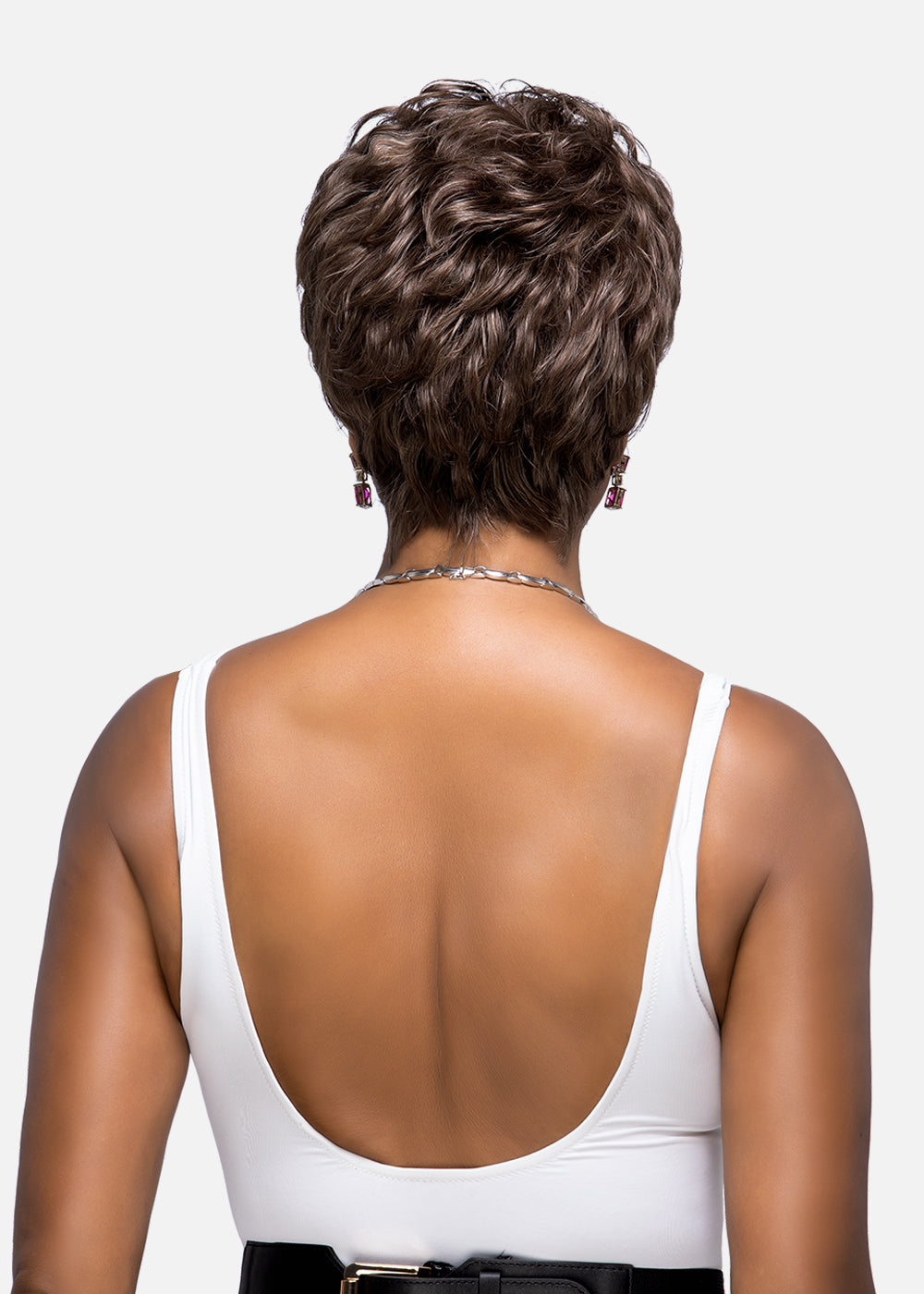 H209-V is an 8 inch layered short pixie style with loose tape curl and tapered back that offer a very elegant look. Pure stretch cap stretches throughout the entire perimeter inside which lets you wear it comfortably all day long without causing unwanted headache. 100 percent human Remi hair enhances the natural beauty even more. Whether you wear it to your work, or a night-out, it will surely turn heads towards you.