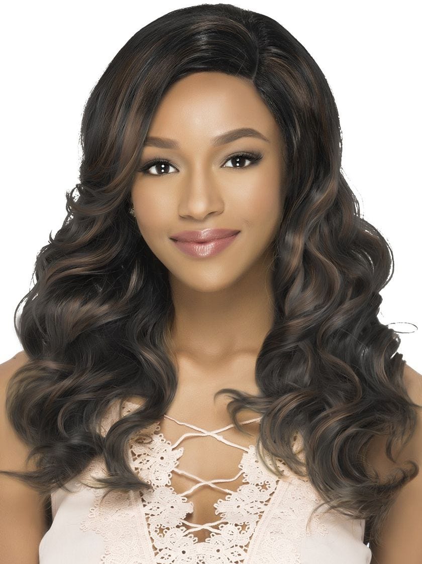The Helena Lace Front Wig by Vivica Fox is a 21" layered loose deep wave style with a swept bang and invisible left side part. Includes a natural baby lace front with new Futura fibers for styling options. A sultry style with trendy loose deep waves that is mature, yet all age appropriate.