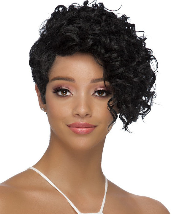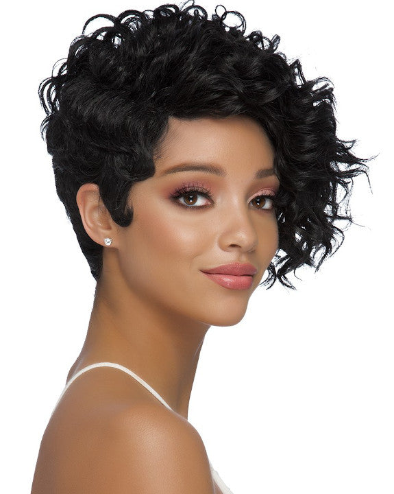 Nalo by Vivica Fox is an short layered deep wave on one side with a finger wave side & back.
