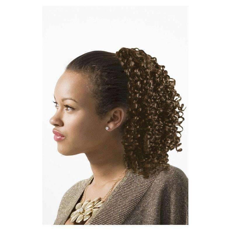 The Sunset Hairpiece by Vivica Fox is a synthetic drawstring pony in a tight curled style.