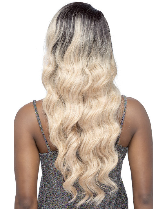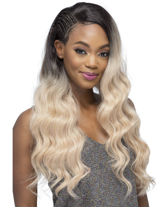 Yesica by Vivica Fox is a 26 inch layered body wave with invisible corn row braids on the side.